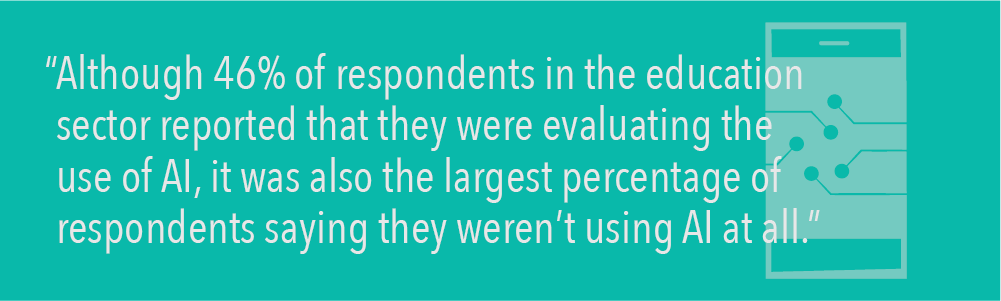 However, an annual O’Rielly survey revealed that education was one of two sectors with the fewest respondents (9%) reporting that they currently had AI projects in production. Although 46% of respondents in the education sector reported that they were evaluating the use of AI, it was also the largest percentage of respondents saying they weren’t using AI at all.