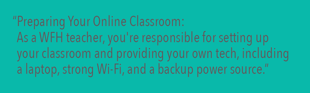 As a WFH teacher, you're responsible for setting up your classroom and providing your own tech, including a laptop, strong Wi-Fi, and a backup power source.
